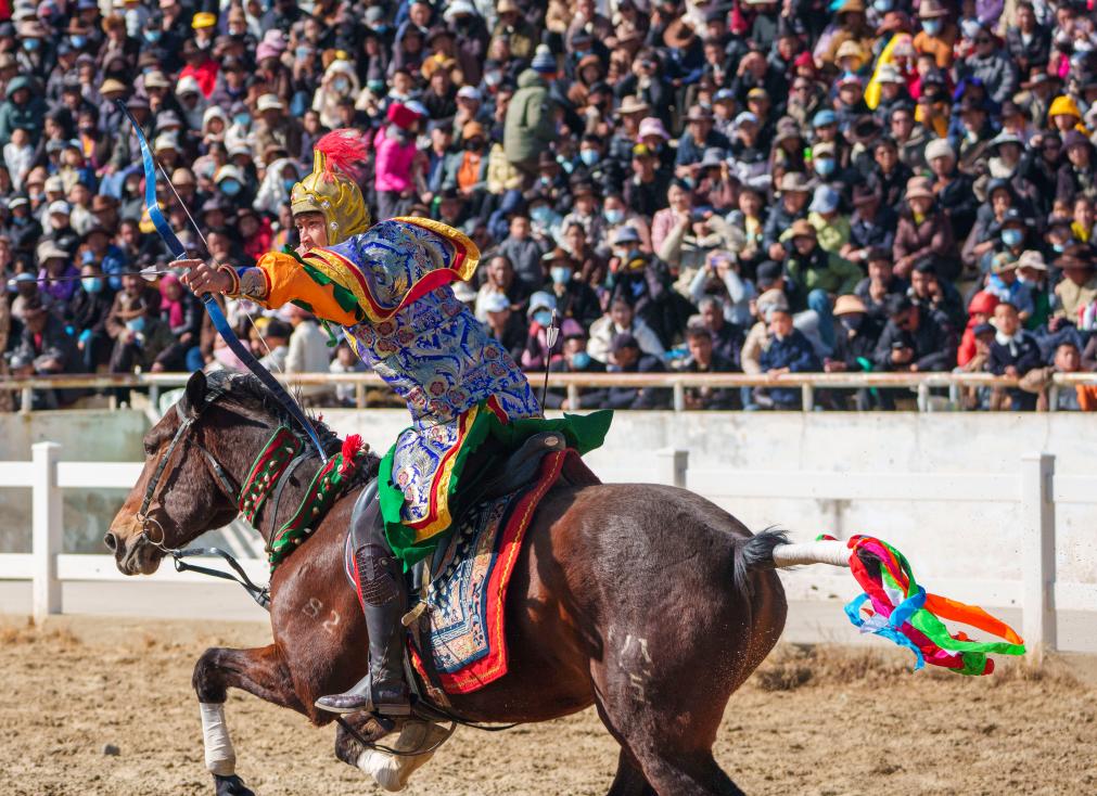 2月20日,马术队员在表演马背传统响箭技巧。新华社记者 丁增尼达 摄