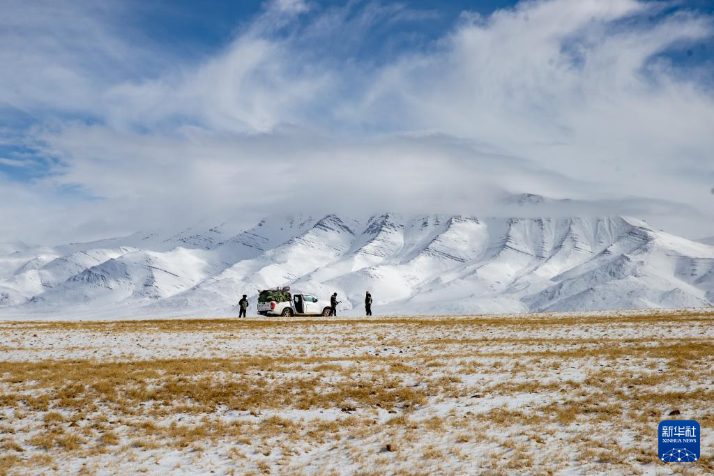 4月9日,羌塘国家级自然保护区那曲地区管理局野生动物专业管护员们在雪山前观察地势。新华社记者 姜帆 摄