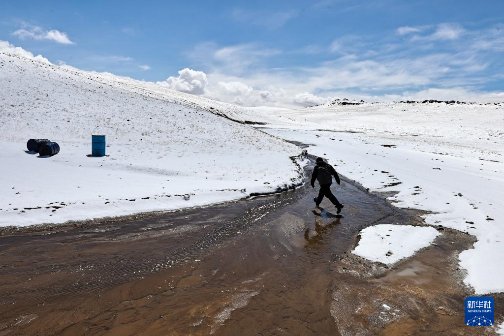4月9日,在巡护途中遇到暴雪,羌塘国家级自然保护区那曲地区管理局野生动物专业管护员格桑伦珠徒步为车队勘察安全线路。新华社记者 姜帆 摄