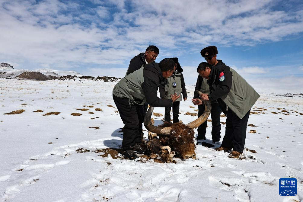 4月10日,羌塘国家级自然保护区那曲地区管理局野生动物专业管护员们在“巴毛穷宗”地区测量一头异常庞大的野牦牛遗骸。新华社记者 姜帆 摄