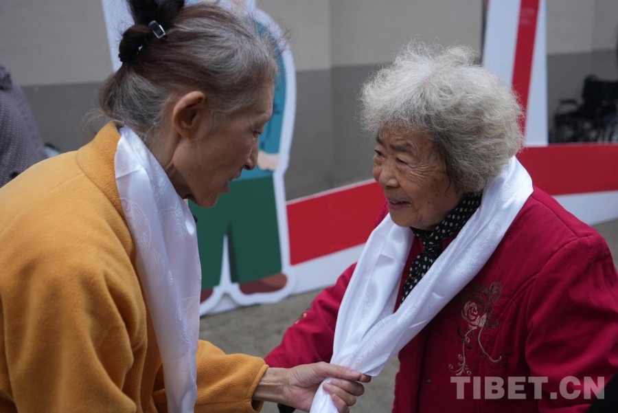 图为参会的十八军老西藏后代代表向到会的离退休老干部及老阿姨们敬献哈达