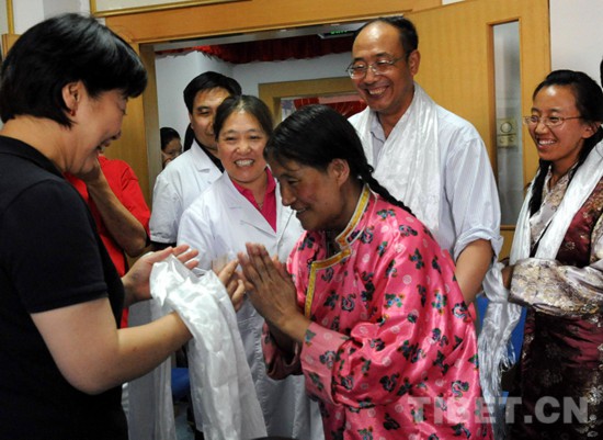 图为术后的斯求卓玛在北京藏医院向帮助她治病的北京安贞医院医生顾虹(左一)和时任新华社记者唐召明(右二)等人敬献哈达(王普2010年5月20日摄)