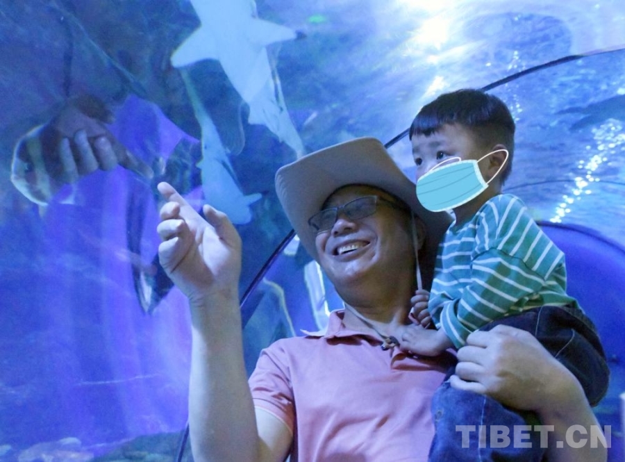 图为唐召明抱着小卓玛在太平洋海底世界 摄影:吉色