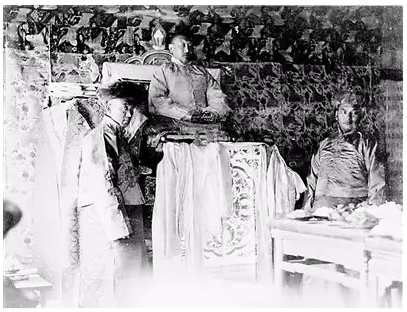 图为1935年,九世班禅额尔德尼·曲吉尼玛(中)在内蒙古各地为僧众祈祷祝福 图片来源:中国之声公众号