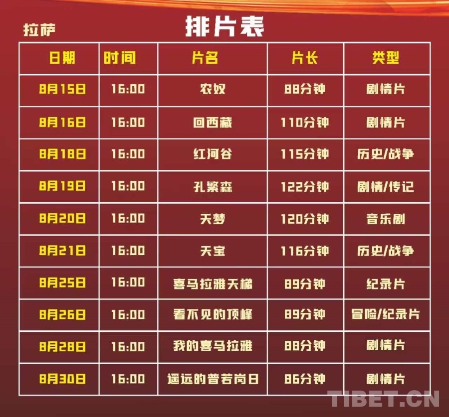 图为“庆祝西藏自治区成立60周年”主题影展排片表