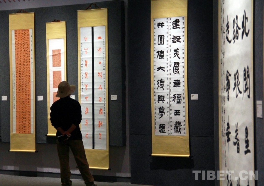 图为观众在“雪域古城·圣地拉萨”第七届书画摄影艺术展欣赏书法作品 摄影:赵钊