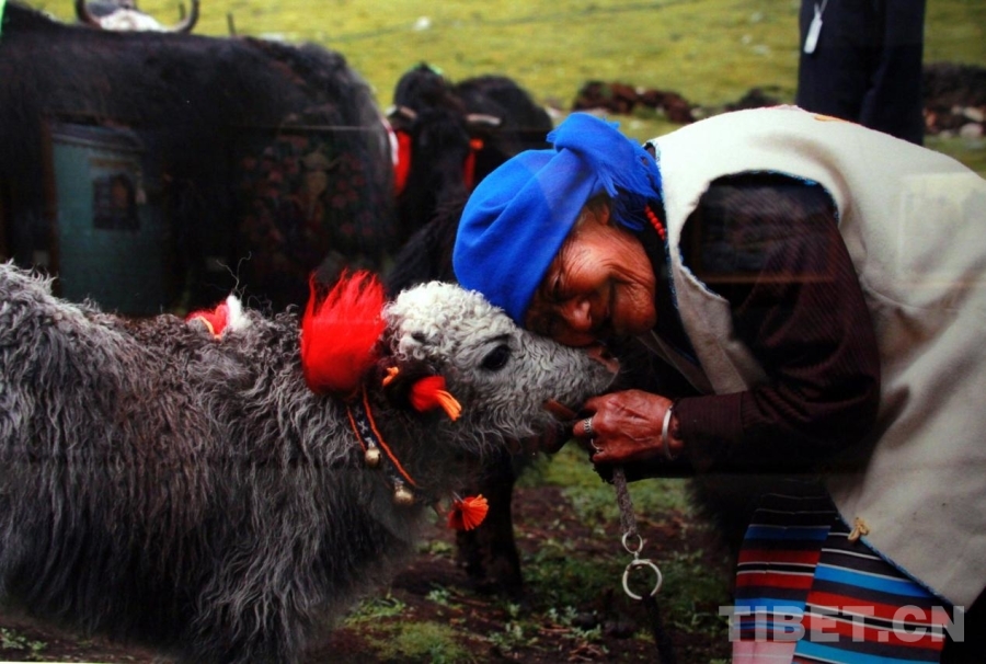 图为“雪域古城·圣地拉萨”第七届书画摄影艺术展摄影作品《奶奶与牛犊》 摄影:温都苏 翻拍:赵钊