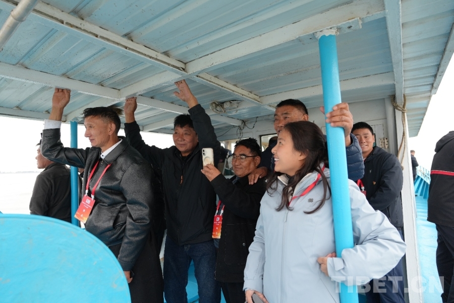 图为西藏基层干部学习参观团成员在船上拍摄海景 摄影:王茜