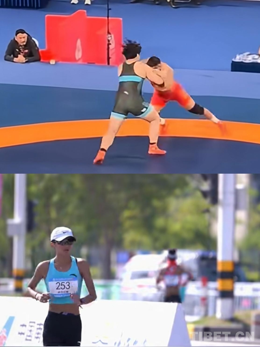 视频截图为西藏摔跤运动员洛松西绕(上)和竞走运动员卓玛拉姆(下)在比赛中