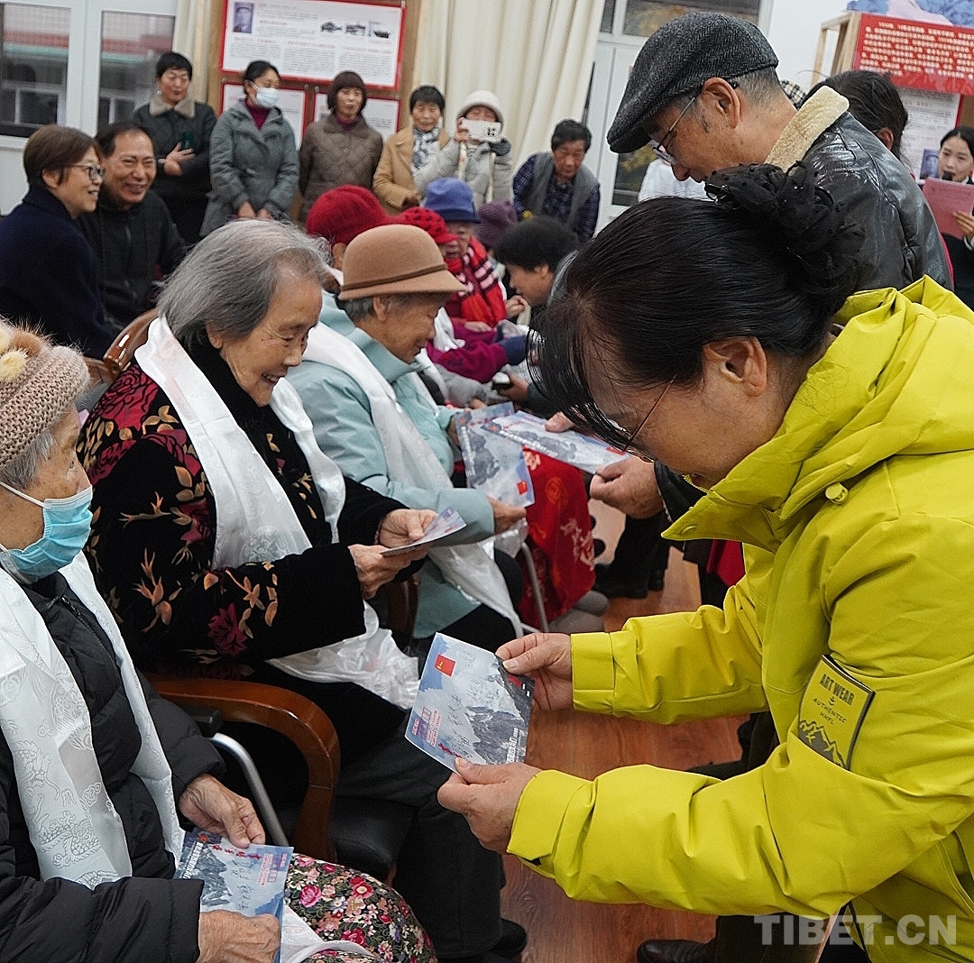 图为首批进藏女兵代表郭振华阿姨赠送纪念邮简