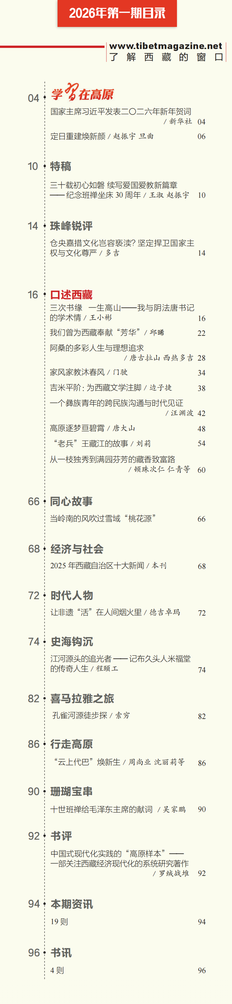 “律回岁晚冰霜少,春到人间草木知。”在这个春意萌发的时节,《中国西藏》汉文版2026年第1期如期与读者见面了。本期杂志是“口述西藏”专刊,以口述史的方式连接西藏的历史与现在,复原官方档案之外个体的体验和集体记忆,让历史变得有血有肉,赋予人文价值和情感力量。