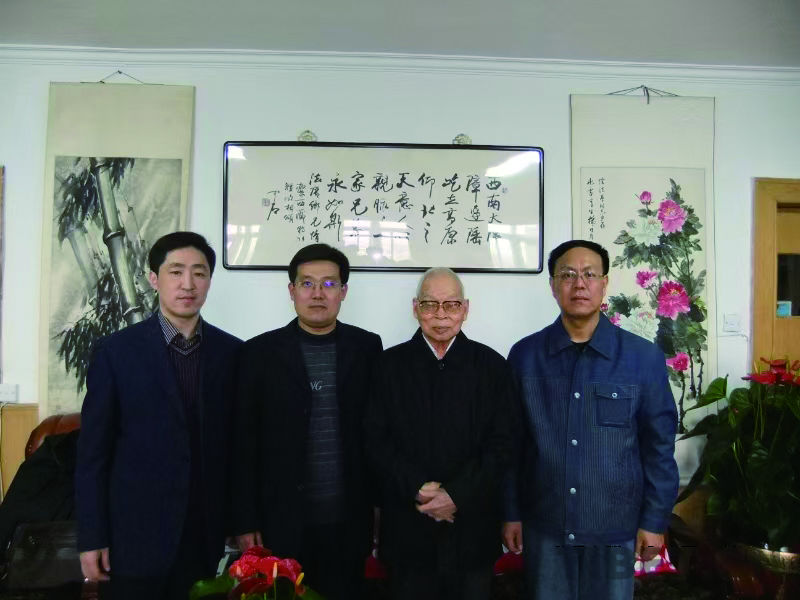 2010年4月,王小彬(右一)、王茂侠(左一)、孙玉华(左二)在北京西四大拐棒胡同阴法唐(右二)同志家中采访留影。王小彬供图