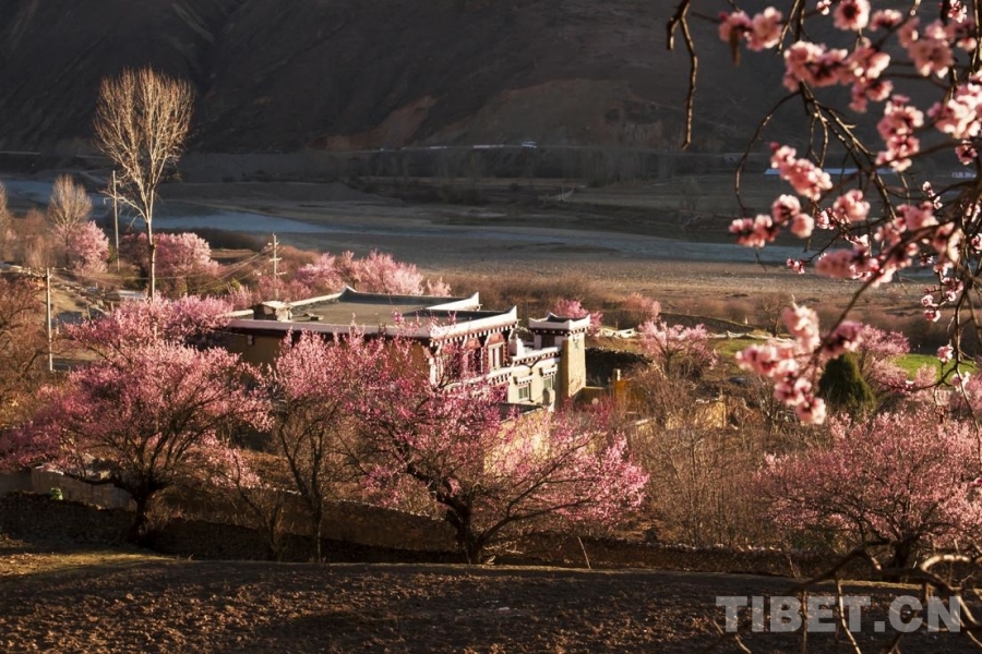 光影中的道孚杏花和民居