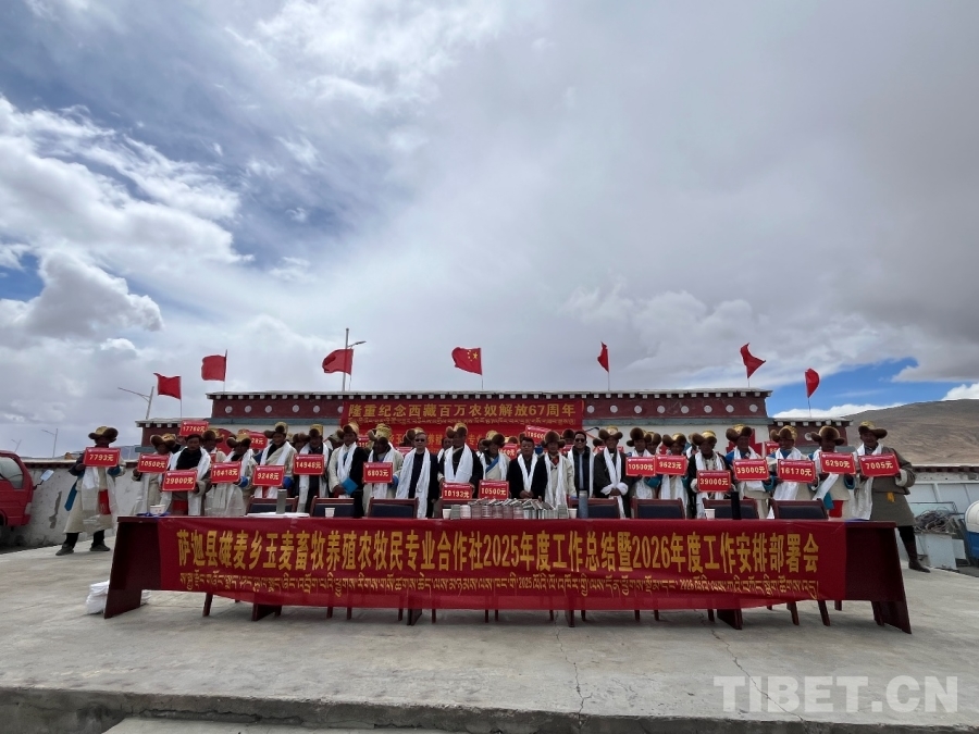 中国西藏网讯 3月28日,西藏日喀则市萨迦县雄麦乡举行纪念西藏民主改革67周年暨2025年度玉麦畜牧养殖农牧民专业合作社分红仪式。