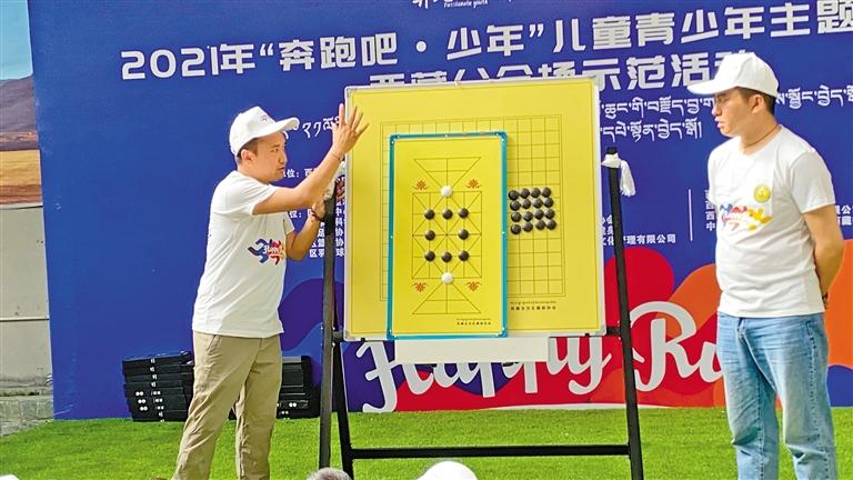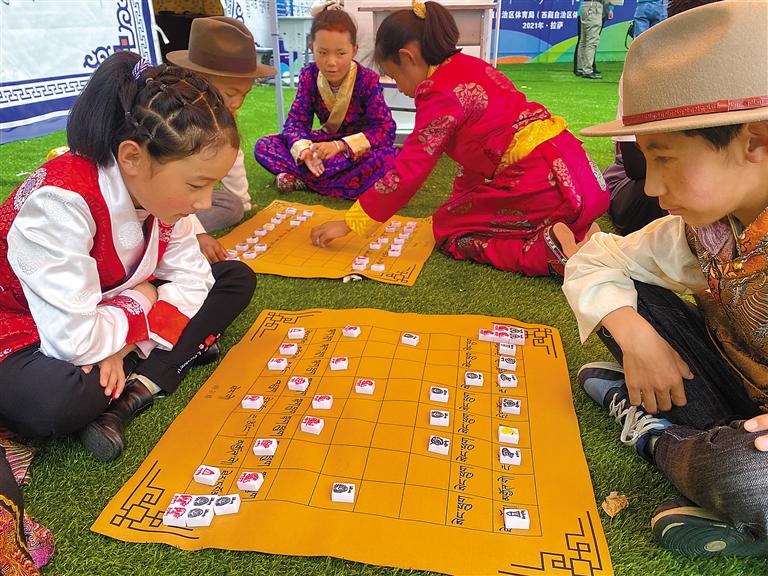 图为在2021年“奔跑吧·少年”青少年主题健身活动西藏分会场上开展藏棋竞赛活动。