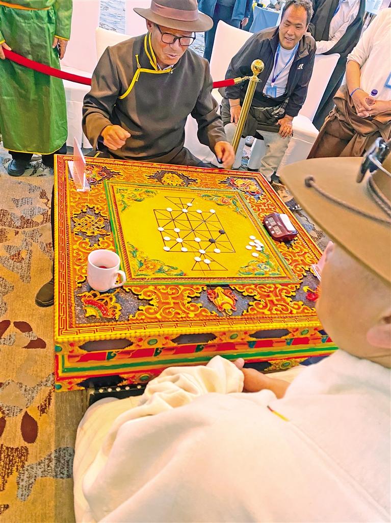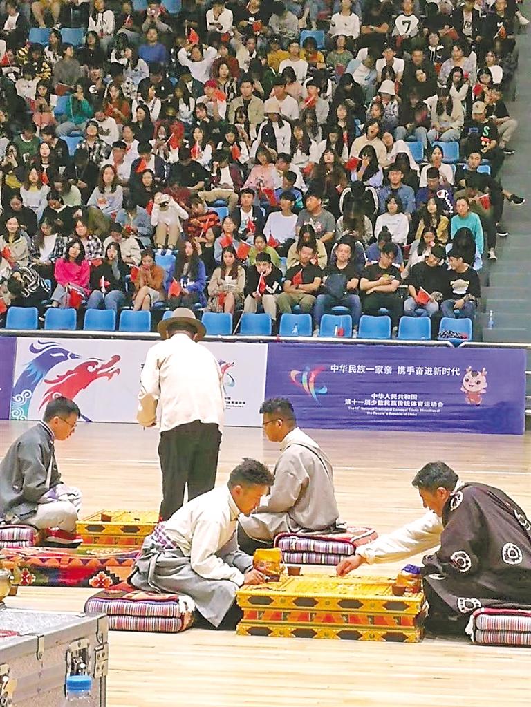 图为第十一届少数民族传统体育运动会上的藏棋竞技。