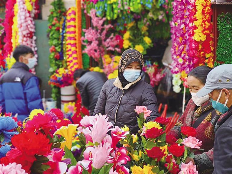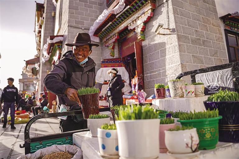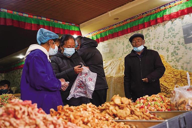 藏历12月初,浓烈的节日氛围早已在拉萨的大街小巷中蔓延。藏历新年是藏族一年中最为隆重的传统节日,每家每户提前一两个月就开始准备年货。从小昭寺路到八廓商城一带,成了拉萨市民流量最大的地方,卡塞、酥油花、青稞苗、罗萨美朵……年货市场琳琅满目。