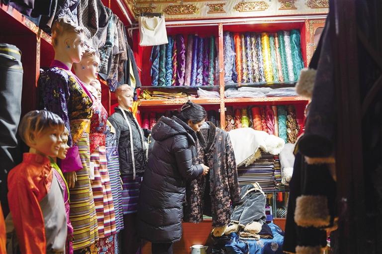 “最近越来越冷了,所以我今天来给女儿买一件厚点的藏装,刚好她生日也快到了。”走进位于北京东路的222藏装店,琳琅满目、颜色绚丽的冬款藏装让人眼前一亮,市民尼玛拉姆正在给女儿挑选藏装。一旁,店员则在给客人测量三围、取藏装、介绍款式,忙得不可开交。