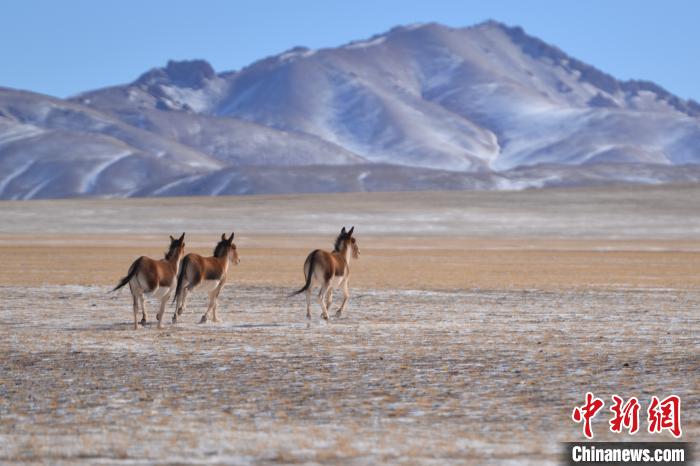 图为冬日雪山下的藏野驴,据悉,藏野驴为国家一级保护动物。 江飞波 摄