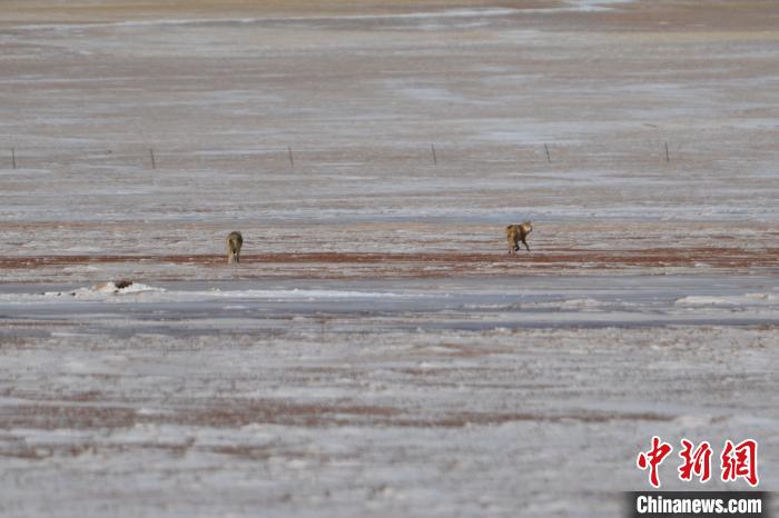 23日下午,在前往那曲市双湖县的途中,记者偶遇两只野狼。 江飞波 摄