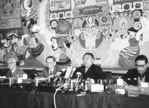 十世班禅大师(左三)坐在人民大会堂西藏厅壁画《扎西德勒图》前。资料图片