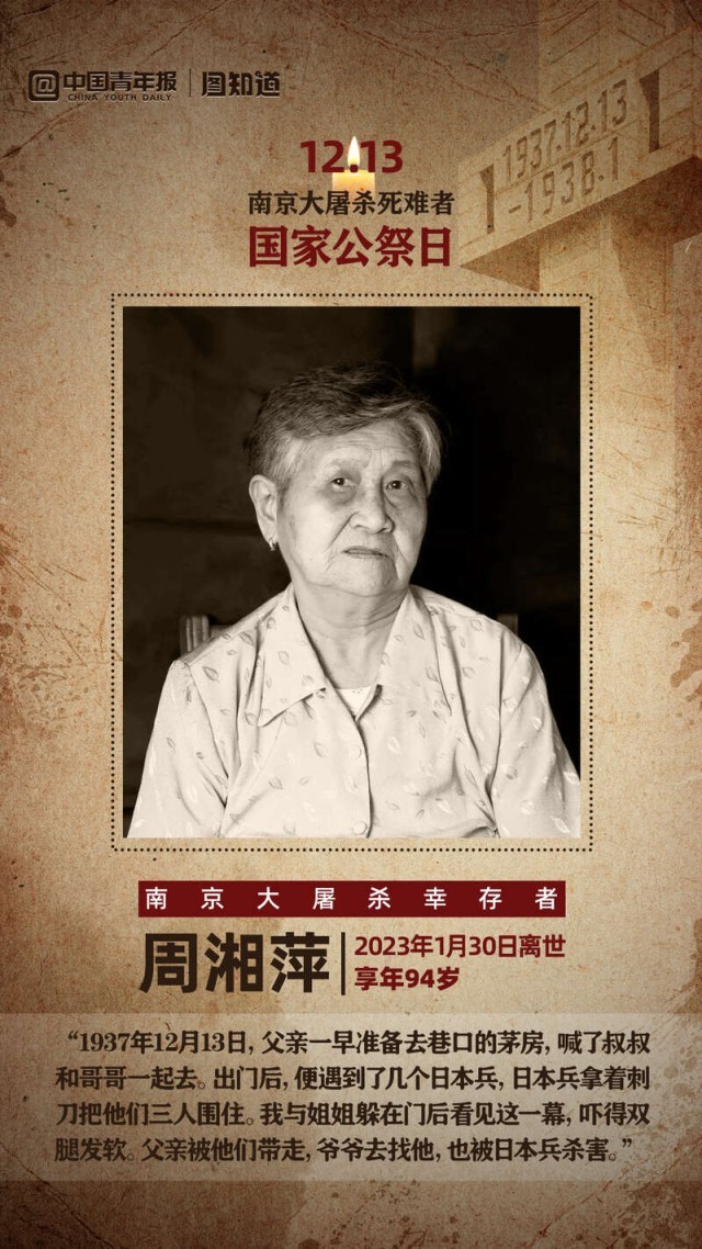 在侵华日军南京大屠杀遇难同胞纪念馆,有一面南京大屠杀幸存者照片墙。每有一位登记在册的幸存者离世,就会熄灭一盏灯。但是,他们在生前通过口述等方式将历史记忆留给了我们。一个个体的生命可能有尽头,但一个国家、一个民族的记忆将代代相传。今天是南京大屠杀死难者国家公祭日,共同走近这些老人,他们离去了,但我们可以点亮一盏名为记忆的灯。