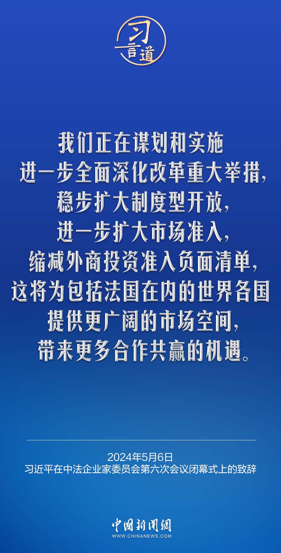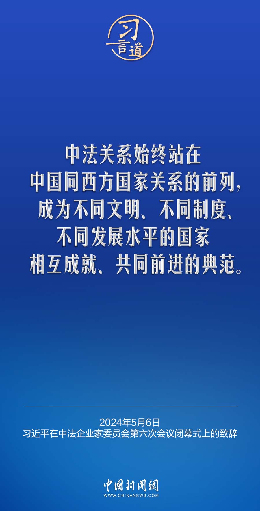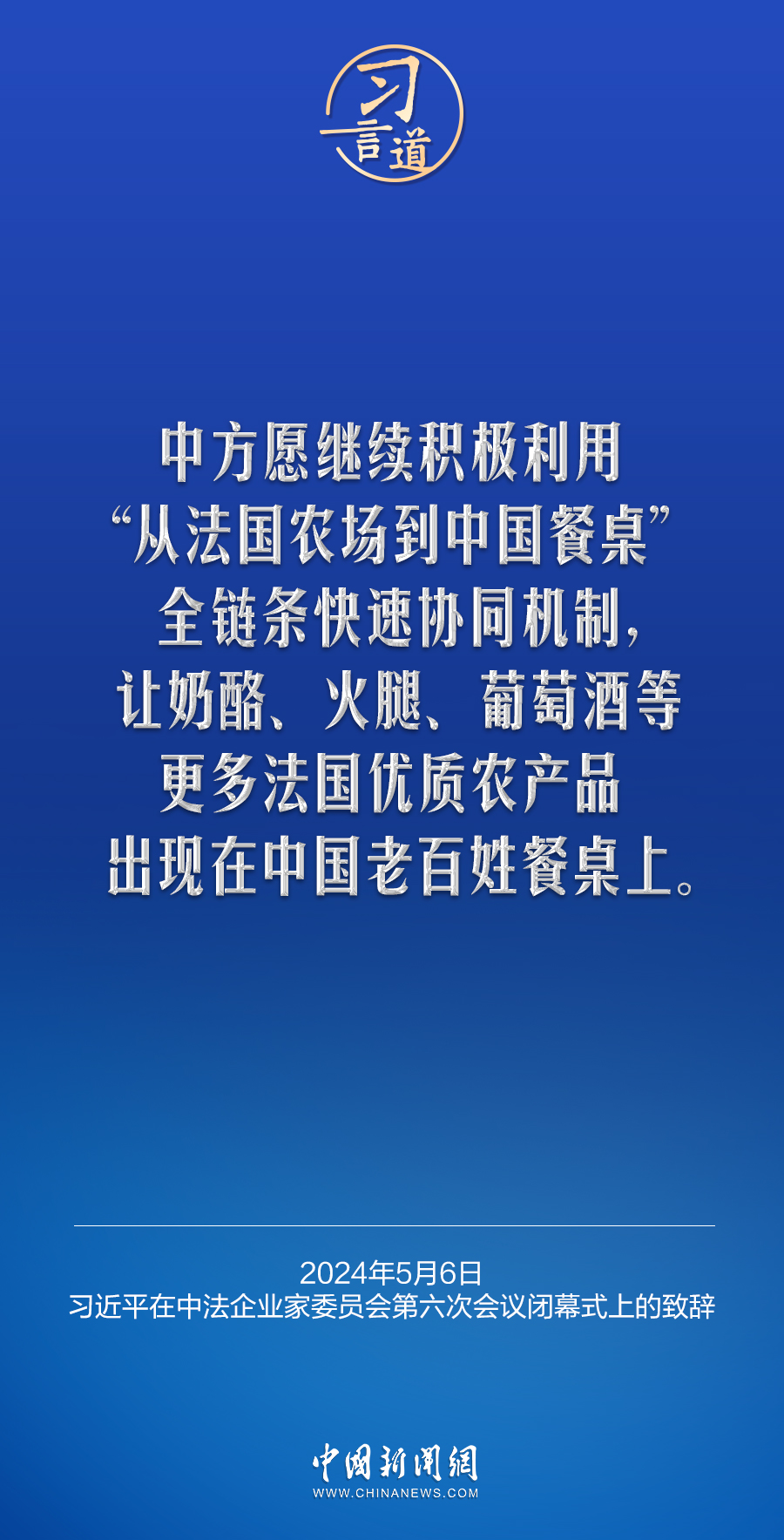 当地时间5月6日下午,国家主席习近平在巴黎同法国总统马克龙共同出席中法企业家委员会第六次会议闭幕式,并发表题为《继往开来,携手开创中法合作新时代》的重要致辞。习近平指出——