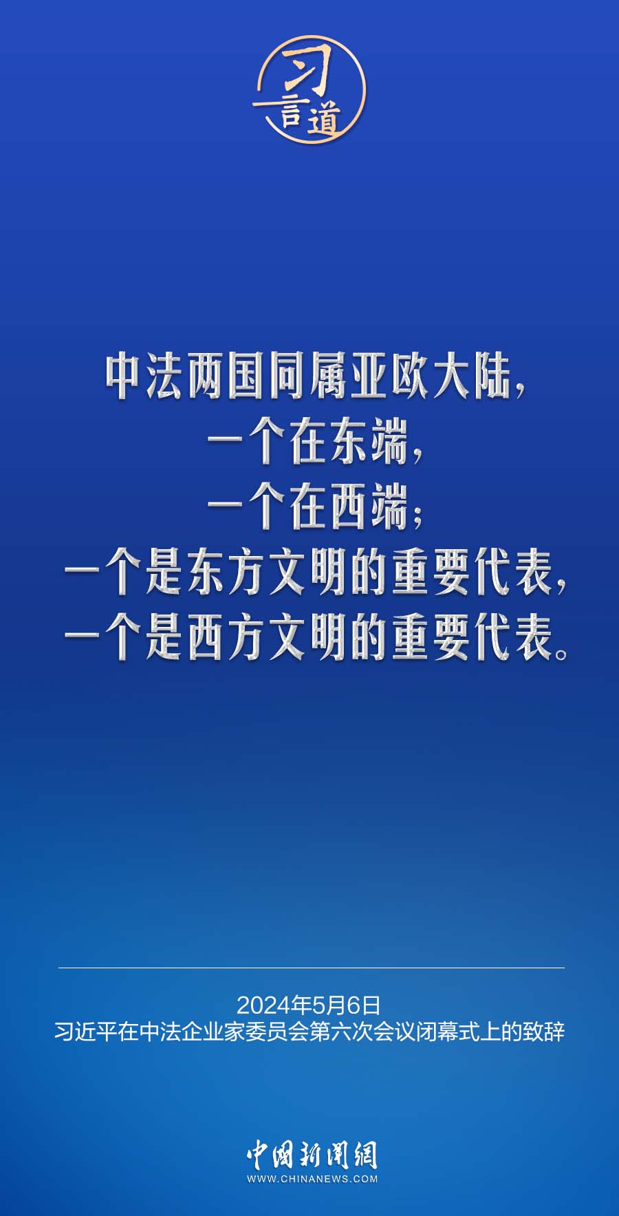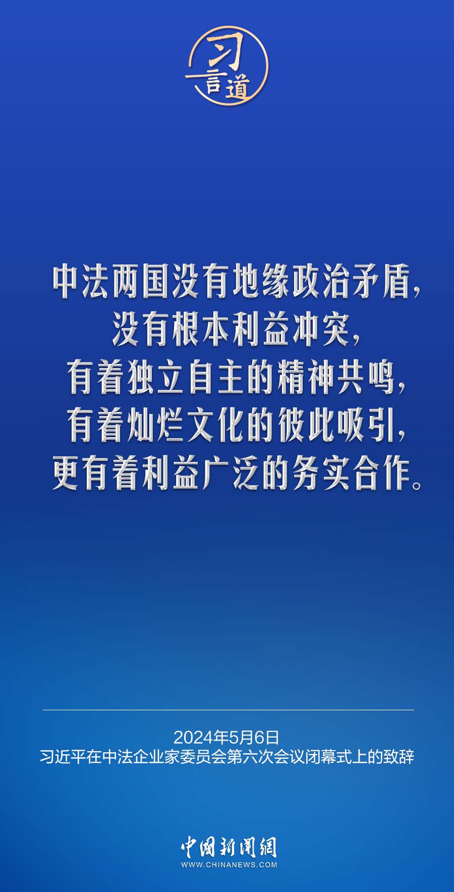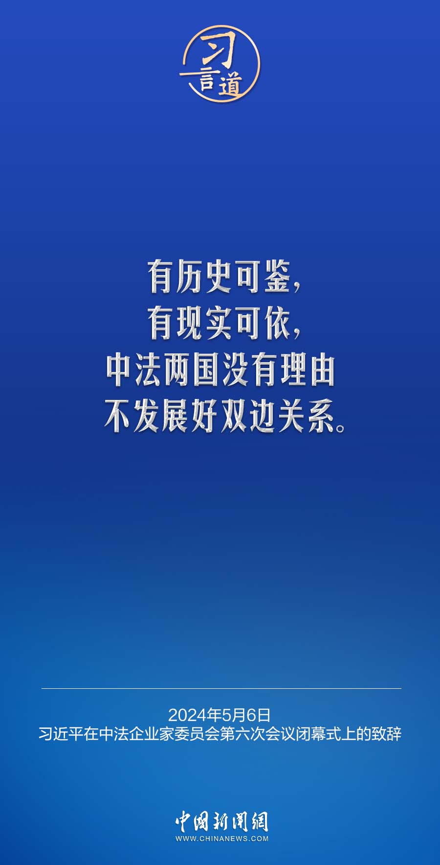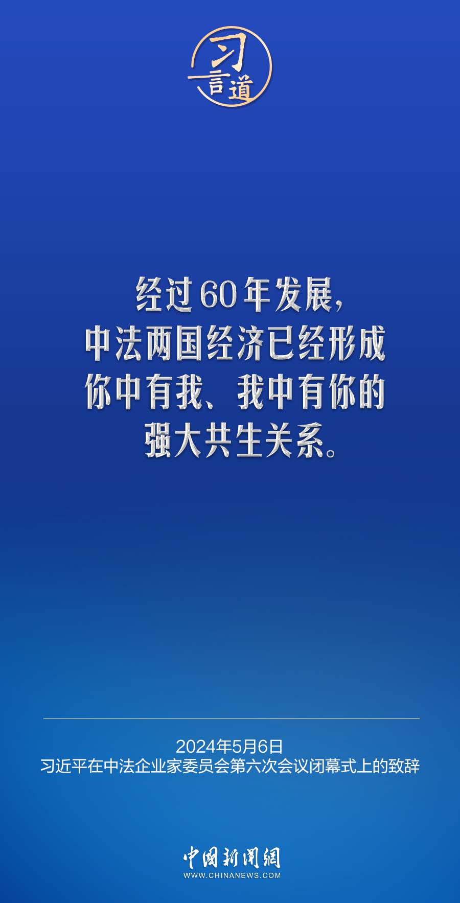 当地时间5月6日下午,国家主席习近平在巴黎同法国总统马克龙共同出席中法企业家委员会第六次会议闭幕式,并发表题为《继往开来,携手开创中法合作新时代》的重要致辞。习近平指出——