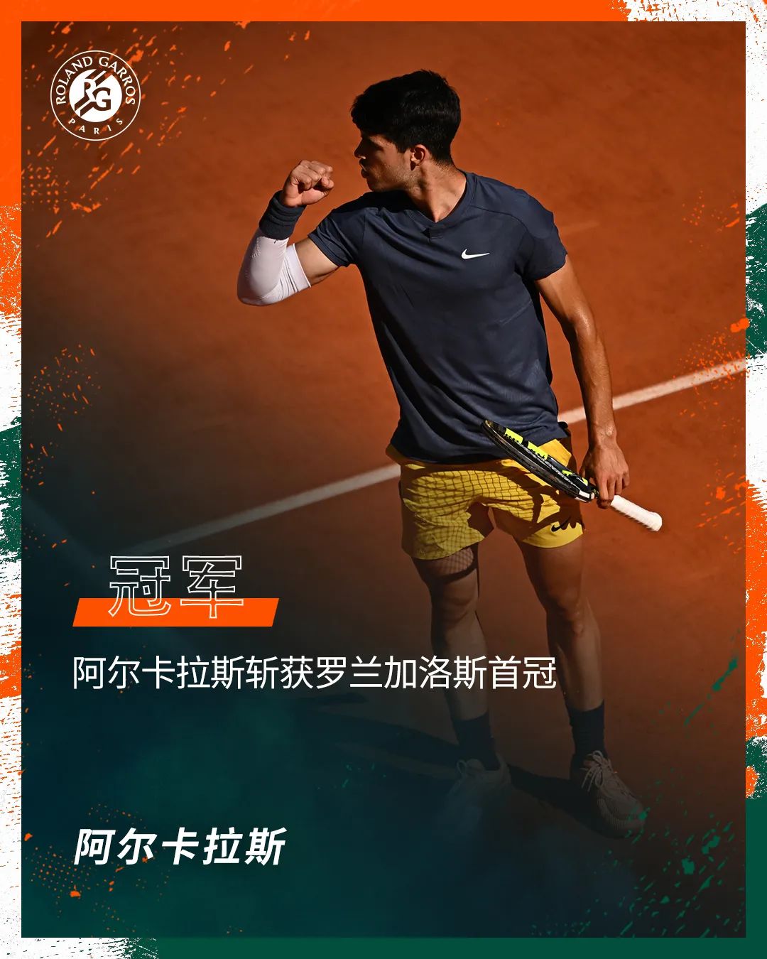 这是阿尔卡拉斯法网首冠,赛季第2冠,大满贯第3冠,职业生涯单打第14冠。在21岁零1个月的年龄,他已经将硬地、草地和红土大满贯奖杯收入囊中,距离全满贯仅差一座澳网奖杯。