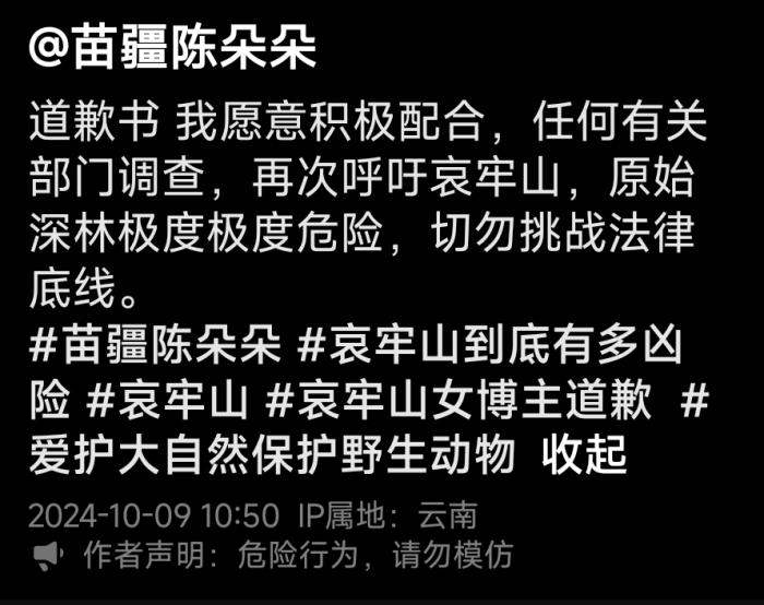 10月9日,“苗疆陈朵朵”发布道歉书,承认自己进入保护区的事实,称愿意积极配合任何有关部门调查。同时强调自己是在官方发布通告之前进的山,且虽然进入了原始森林,但没有破坏任何自然环境,不存在违法行为。