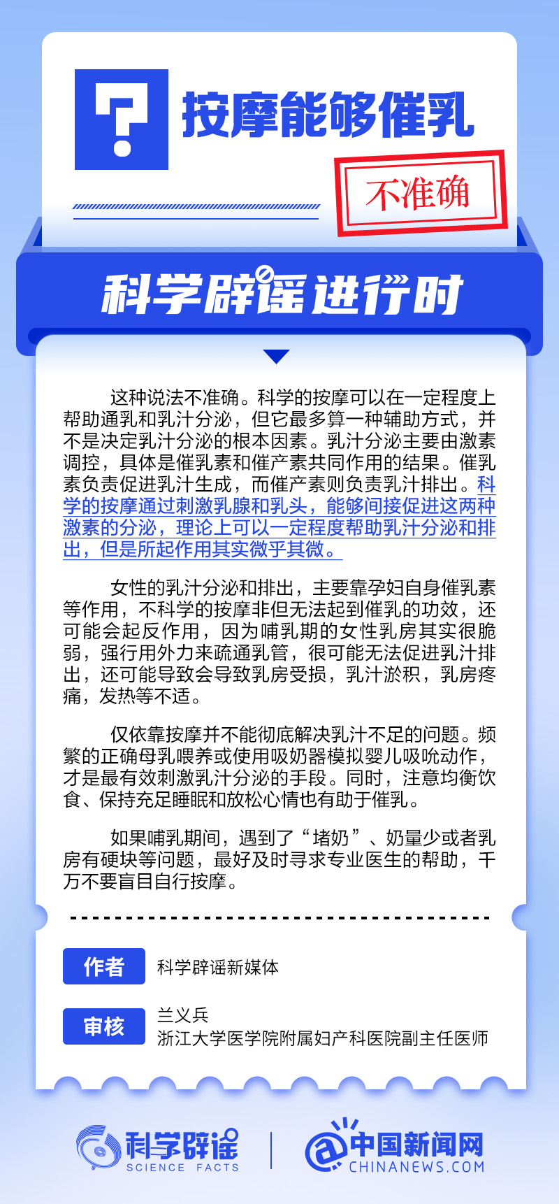 中新网1月8日电 科学的按摩可以在一定程度上帮助通乳和乳汁分泌,但它最多算一种辅助方式,并不是决定乳汁分泌的根本因素。乳汁分泌主要由激素调控。科学的按摩,能够间接促进激素的分泌,理论上可以一定程度帮助乳汁分泌和排出,但是所起作用其实微乎其微。(来源:@科学辟谣 中国新闻网微博)