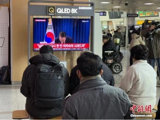 当地时间2024年12月7日,在韩国首尔火车站,民众观看尹锡悦发表讲话的电视画面。尹锡悦当日通过电视直播发表对国民谈话,就短暂紧急戒严风波向国民道歉。中新社记者 刘旭 摄