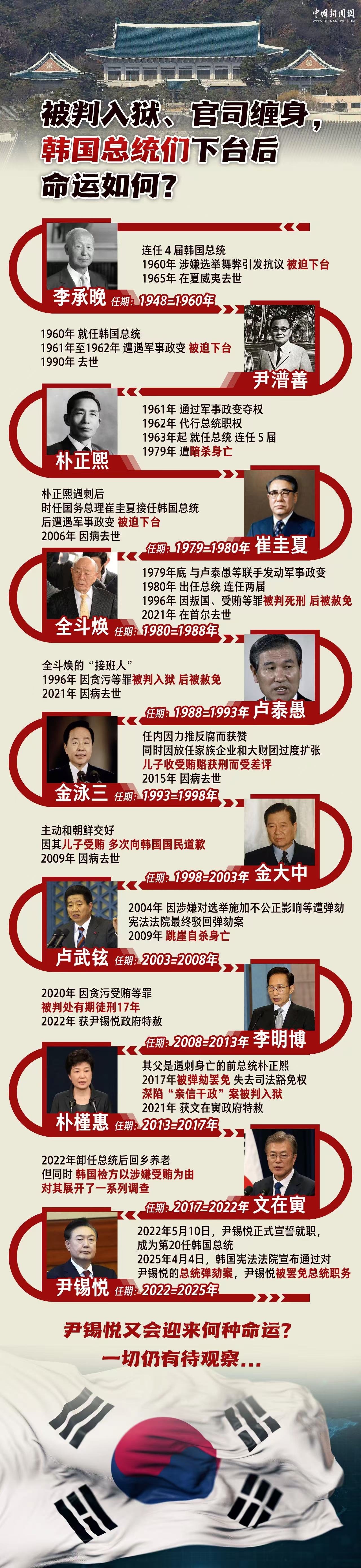 回看韩国历史,有韩国总统因军事政变被迫下台,也有总统因罪被判入狱,还有人官司缠身、毁誉参半……未来,尹锡悦又会迎来何种命运?一切仍有待观察。
