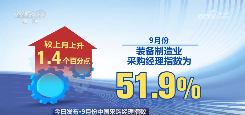 新动能继续较快增长。9月份装备制造业采购经理指数为51.9%,较上月上升1.4个百分点。高技术制造业连续两个月稳定在51%以上。消费品制造业方面,长假临近、开学季等因素拉动居民消费意愿释放,9月份消费品制造业采购经理指数为50.6%,较上月上升1.4个百分点,创今年以来高点。