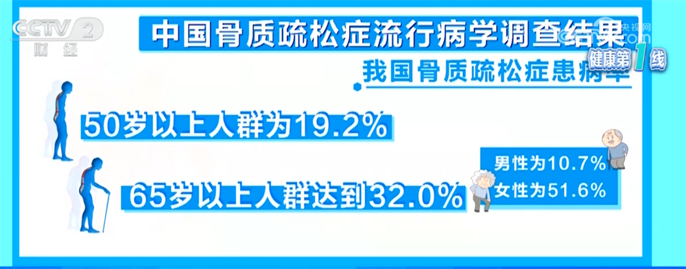 中国骨质疏松症流行病学调查结果显示:我国50岁以上人群骨质疏松症患病率为19.2%;65岁以上人群达到32.0%,其中男性为10.7%,女性高达51.6%。中老年女性骨质疏松问题尤为严重。