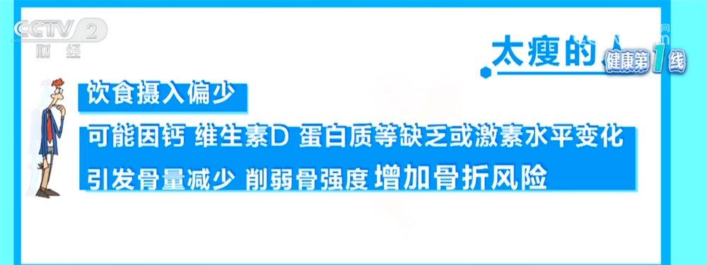 复旦大学附属华东医院骨质疏松科主任医师洪维称:“研究显示,如果你的BMI指数超过35,你的骨质疏松性骨折的风险也会提高。当你的脂肪全部长在腹部的时候,这个脂肪里面会产生很多炎症因子,这个会加速骨骼的衰老。另外,当你过于肥胖的时候,你跌倒风险会高,头重脚轻,所以这个时候也会发生骨折。”