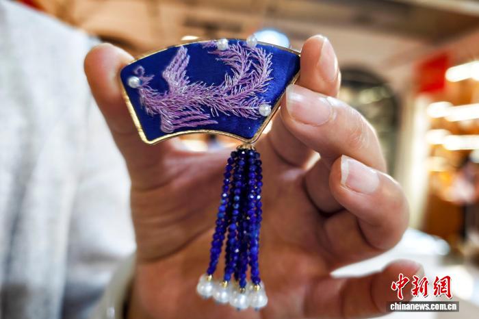 2月27日,湖南长沙,成新湘展示《凤穿牡丹》系列变色湘绣饰品。中新社记者 唐小晴 摄
