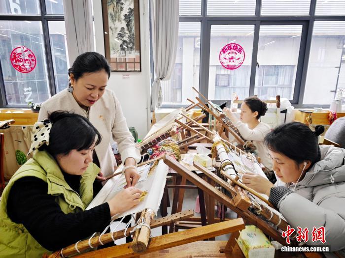 2月27日,湖南长沙,成新湘指导绣娘刺绣。中新社记者 唐小晴 摄