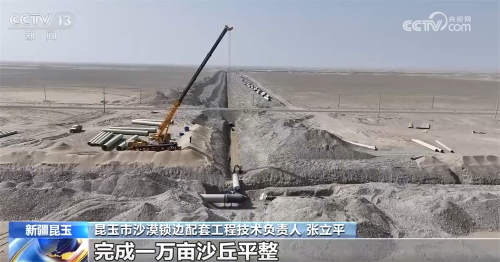 据昆玉市沙漠锁边配套工程技术负责人张立平介绍:“现在,我们完成了沙漠土地的粗平工程,接下来进行管道的铺设和通水工作,计划在4月10日之前完成一万亩沙丘平整,达到种植条件。”