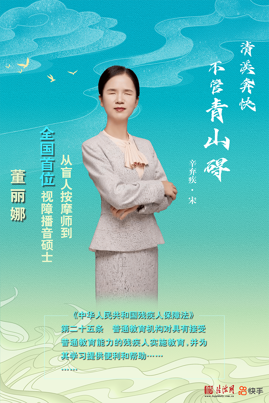 董丽娜先天弱视,10岁失明。但她自强不息、排除万难,在22岁时争取到视障人士播音培训机会,获得一级甲等普通话证书,成为《丽娜品读时间》的主持人。2020年考入中国传媒大学攻读硕士学位,2023年毕业成为全国首位视障播音硕士。