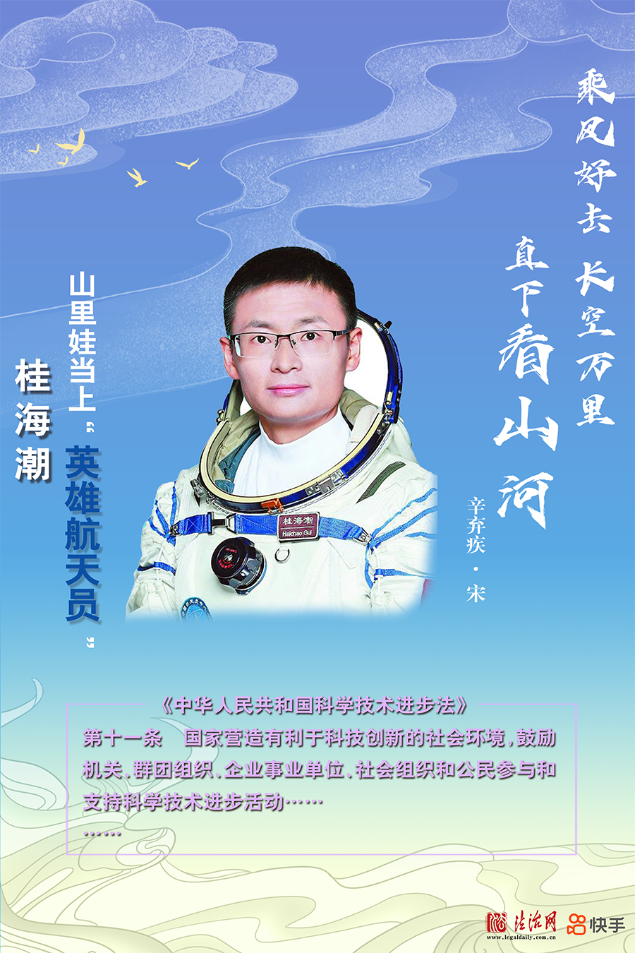 1986年,桂海潮出生在云南省保山市施甸县一个普通家庭,本硕博就读于北京航空航天大学宇航学院飞行器设计专业,目前任该院航天飞行器技术系教授、博士生导师。他艰苦训练、历经重重考核,光荣入选神舟十六号乘组,成为我国首位执行载人飞行任务的载荷专家。