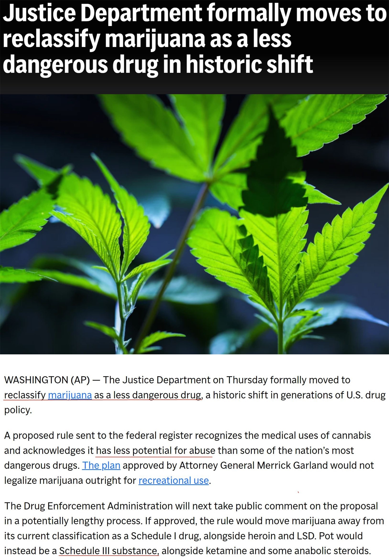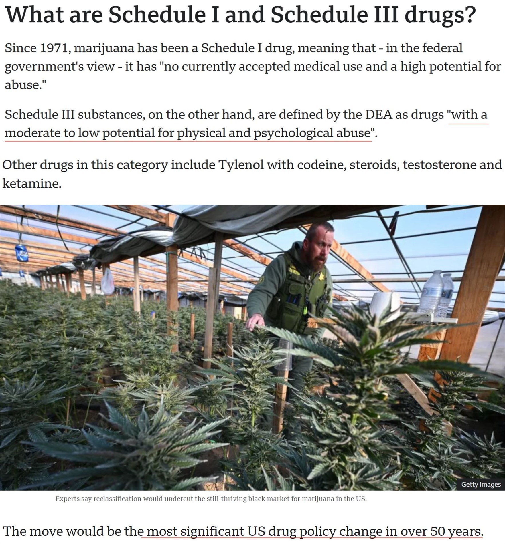 如果经过60天的公众意见征询期后最终获批,新规则虽然不会在联邦层面将大麻完全合法化,但会将其移出《美国联邦管制物质法案》中列管海洛因等最危险毒品的“附表一”,转而归入列管氯胺酮和类固醇等危险性较低药物的“附表三”。