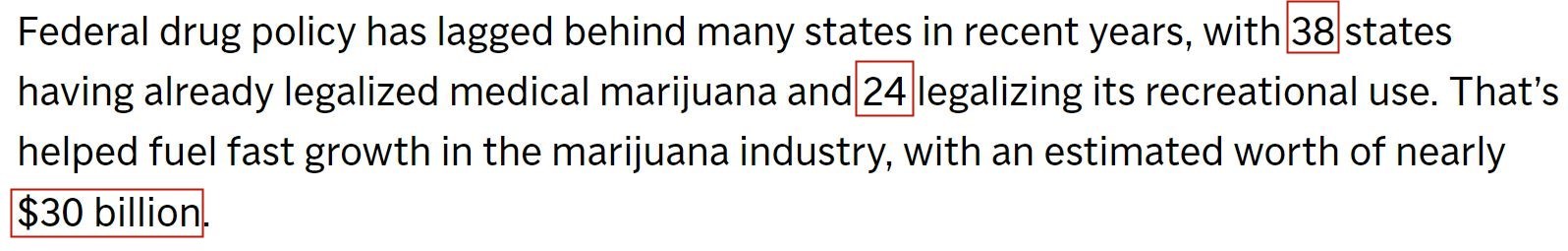 这推动了大麻产业在美国的快速发展,估计其商业及市场价值近300亿美元。
