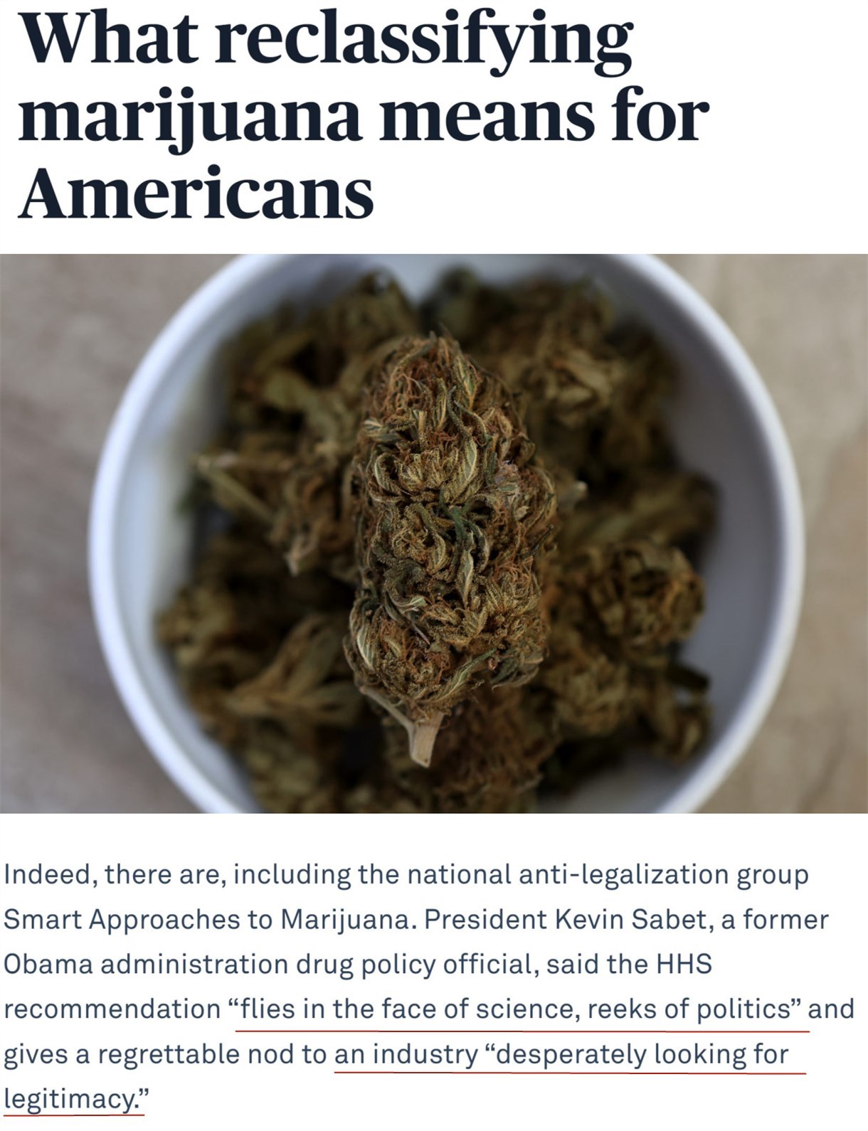 前白宫毒品政策官员凯文·萨比特批评称,此举“公然藐视科学,带有政治意味”,等于是承认了一个“拼命寻求合法性”的行业。