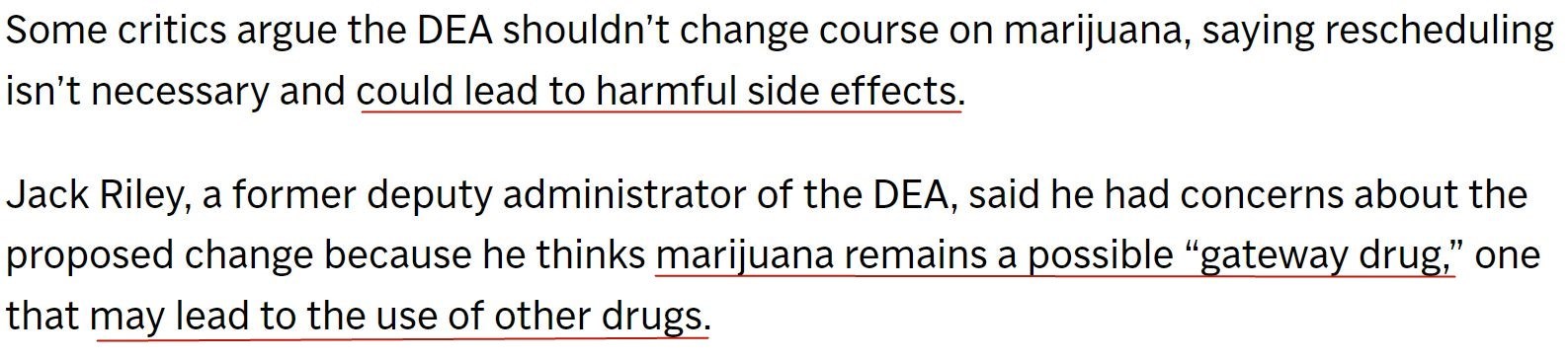 美国禁毒署前副署长杰克·莱利对拟议中的规则更改感到担忧。他认为,大麻仍是一种“入门毒品”,可能导致对其他毒品的使用。