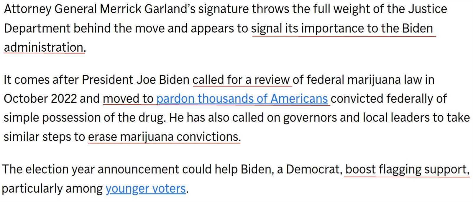 美联社分析指出,美司法部对修改大麻分类的全力支持,表明了此举对拜登政府的重要性。拜登在大选前夕推动大麻去罪化,就是为了吸引年轻选民的支持。
