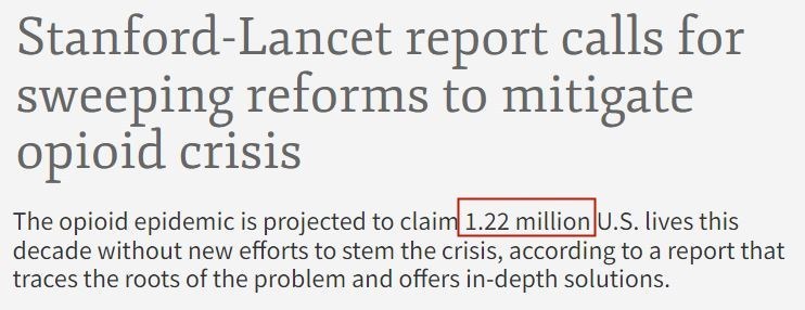 根据美国斯坦福大学和英国《柳叶刀》杂志共同进行的一项研究,如果美国不采取遏制措施,本世纪20年代将有约122万美国人死于过量使用阿片类药物,位列世界第一。