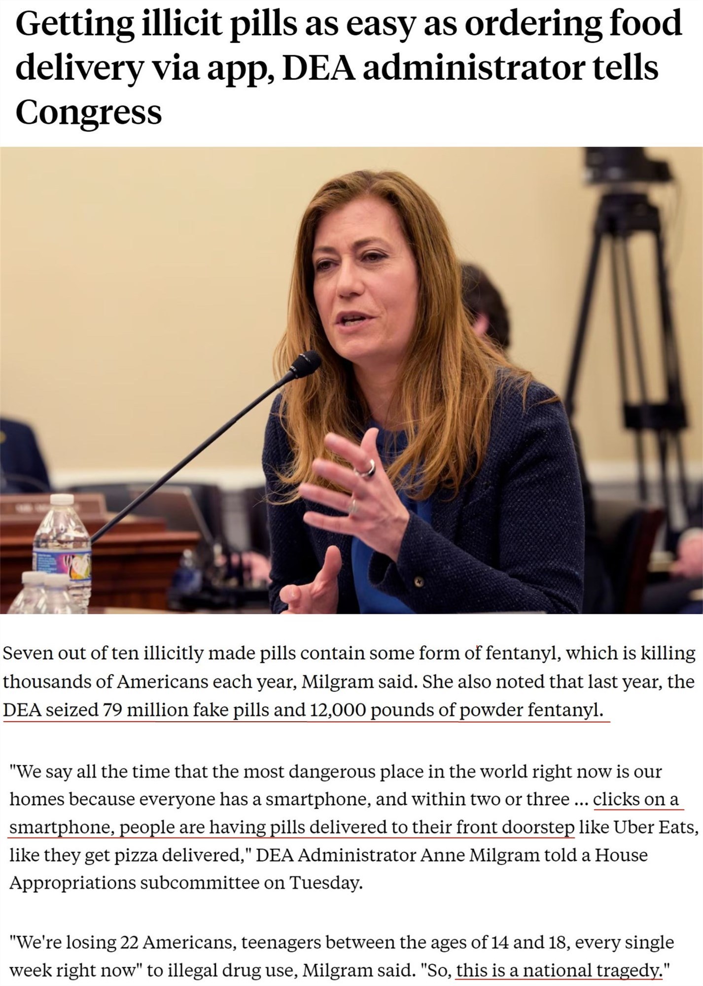 美国禁毒署署长安妮·米尔格拉姆本月早些时候告诉国会:“现在世界上最危险的地方就是我们的家,因为每个人都有智能手机,只要用手指点上两三下,就能像在外卖平台点比萨一样,在家门口收到非法药丸。”
