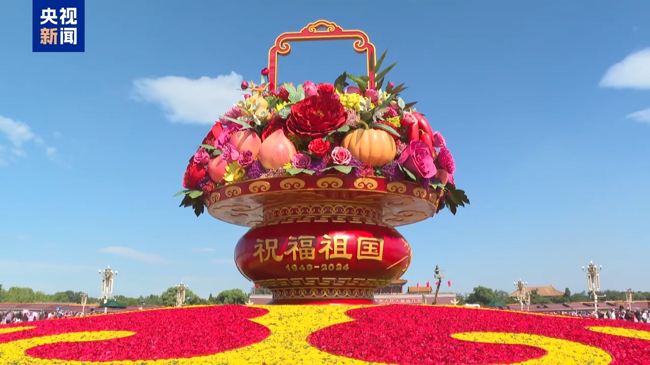 今天,北京秋高气爽,阳光明媚。天安门广场上游人如织,广场中央布置一新的巨型大花篮精彩亮相,格外耀眼,吸引了众多游客围观拍照。
