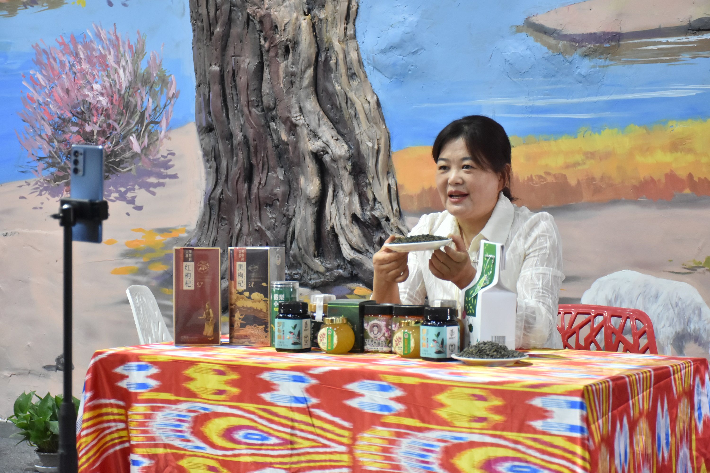 因为电商发展而受益的不只王晓红。罗布麻茶、罗布麻蜜、尉犁小油馕、库尔勒香梨、若羌红枣、昆仑雪菊……走进总面积近3000平方米的尉犁县电商直播基地,100多种优质农特产品整齐排列,不少主播正在直播。